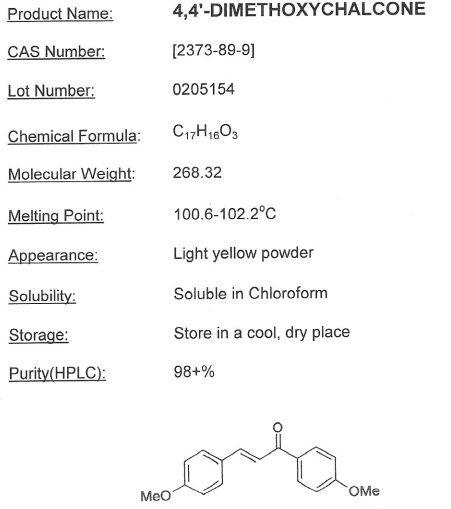 4,4 ‘- Dimethoxychalcone is a chalcone compound with multiple biological activities and a natural phenolic compound. It is a precursor for the biosynthesis of flavonoids and isoflavone compounds.